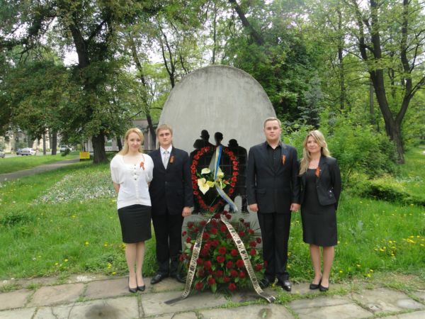 Святкування Дня Перемоги розпочалося з самого зранку в холі Університету: лунала музика воєнних часів, всі вітали один одного, а співробітникам Університету вручали георгіївські стрічки.