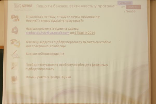 Після майстер-класу представники компаній EY, Nestle, ProCredit Bank, Сільпо та Newbreed презентували програми стажування для студентів випускних курсів. На виставці вакансій до них приєдналися компанії «Воля», KPMG, Ringoo, TMA Draft, «Тіанде», Київський молодіжний центр праці.